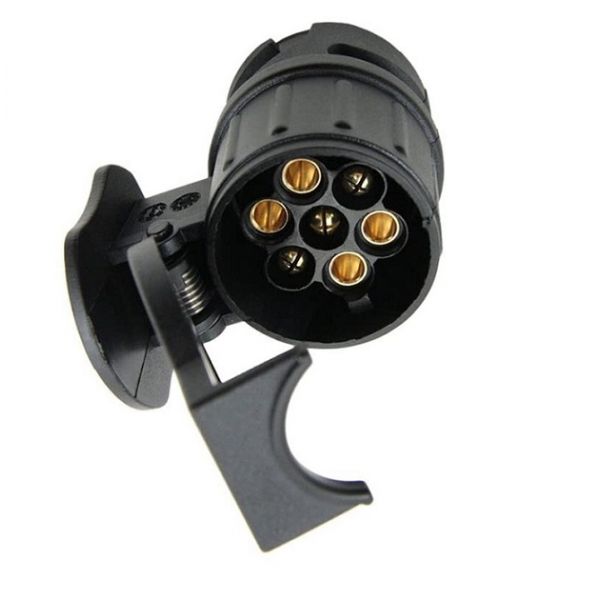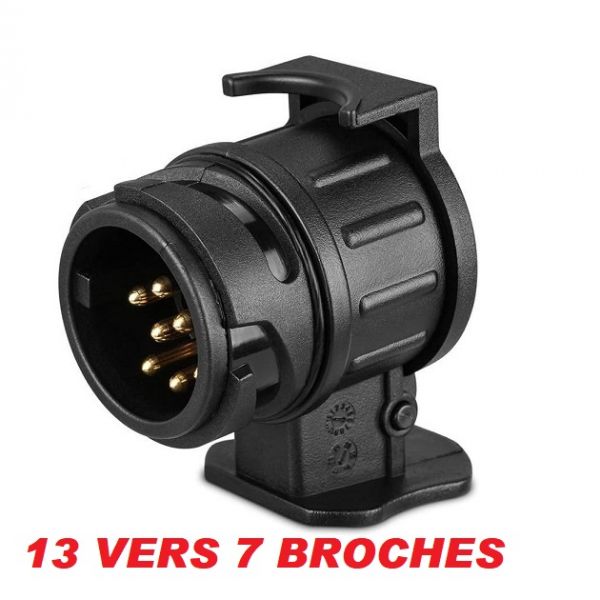 Adaptateur prise attelage 13 broches malles cote vehicule et prise 7 broches femelles cote attelage avec un couvercle.