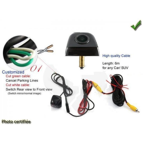 Camera CMOS NTSC AUTOFOCUS Tension 12V Puissance 80mA Resolution 650 lignes Lumination (LUX) 0,5 Etancheite IP67 Camera Angle de vision 170 degres Cable 8m Dimension (L x H x P mm) 25 x 25 x 20 mm Temperature de fonctionnement (degres C) -20 degre ~ 50 degre Possibilite de l installer a l avant comme a l arriere et d inverser cote droit ou gauche (boucle bleu) et haut ou bas (boucle violet) Lignes de stationnement visible a l ecran . longueur de cable 6m