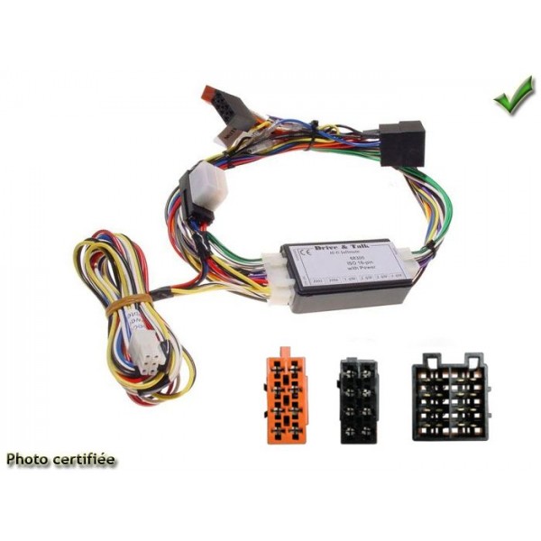 Permet l installation d un kit main libre CK3100 sur un vehicule AVEC un ampli d origine. ATTENTION le son du kit main libre NE SERA retransmit QUE SUR LE HP AVANT CONDUCTEUR ou LES 2 HP AVANT CITROEN C5 2001>08/2004 AVEC AMPLI JBL MERCEDES ML W163 1997>2001 avec AMPLI RENAULT KOLEOS 2008> AVEC AMPLI BOSE a l arriere gauche + RALLONGE PEUGEOT 406 1996>2003 AVEC AMPLI JBL PEUGEOT 406 COUPE 1997>2005 AVEC AMLPI JBL PEUGEOT 607 2001>2004 AVEC AMPLI JBL IMPERATIF A PREVOIR EN PLUS: REF 827600 SI instal PARROT serie MKI / REF 827601 SI instal PARROT CK3000EVO / REF 827604 SI instal THB BURY Equivalence AD000010AA