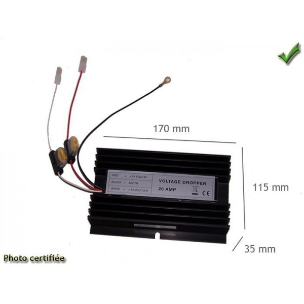 TRANSFORME LE COURANT CONTINU 24 VOLTS EN COURANT CONTINU 12 VOLTS AVEC UNE PUISSANCE MAXIMUM DE 20 AMPERES Permet le branchement d un appareil 12Vdc +/- 2% (voiture) sur une batterie de 24Vdc (camion). Proteges contre les courts-circuits, la surcharge et la surtension de sortie. Connexion par fils Entre Rouge +24V, Noir Masse 24 et 12V, Sortie Blanc +12V.
