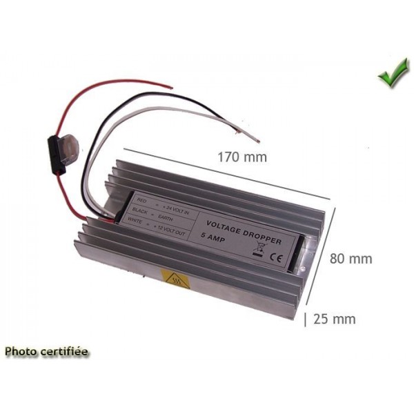 TRANSFORME LE COURANT CONTINU 24 VOLTS EN COURANT CONTINU 12 VOLTS AVEC UNE PUISSANCE MAXIMUM DE 7 AMPERES Permet le branchement d un appareil 12Vdc +/- 2% (voiture) sur une batterie de 24Vdc (camion). Proteges contre les courts-circuits, la surcharge et la surtension de sortie. Connexion par fils Entre Rouge +24V, Noir Masse 24 et 12V, Sortie Blanc +12V.